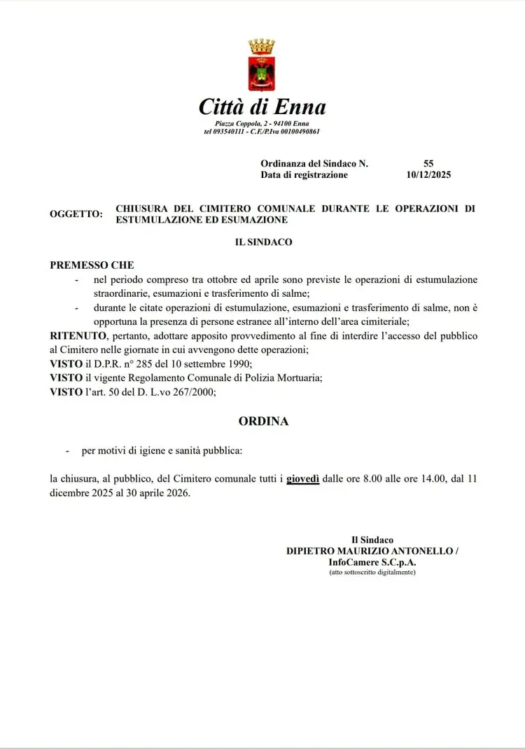 Il Comando della Polizia Locale di Enna comunica che, con propria ordinanza n. 561 del 12/12/2025, in occasione del transito nella Città di Enna della Fiamma olimpica “Milano-Cortina 2026”, prevista per il prossimo martedì 16 dicembre 2025, ha disposto l’istituzione dei seguenti divieti: Per il primo percorso, giorno 16/12/2025, dalle ore 09.30 alle ore 14.00, e comunque fino a cessate esigenze il divieto di sosta con rimozione forzata, per tutte le categorie di veicoli, in ambo i lati delle seguenti vie e piazze: tutta la via S. Agata, piazza Vitt. Emanuele, via Vulturo, via Falautano, viale P. e C. Savoca nel tratto compreso tra Piazza Garibaldi e via Largo Rosso, via Largo Rosso, via Roma tratto compreso tra piazza Colajanni e piazza Duomo, tutto il perimetro di piazza Mazzini, via Orfanotrofio tratto compreso tra piazza Mazzini e via Bagni, via Bagni dall’intersezione con via Orfanotrofio e l’intersezione con via S. Chiara, via S. Chiara, tutta la piazza Colajanni , via…
