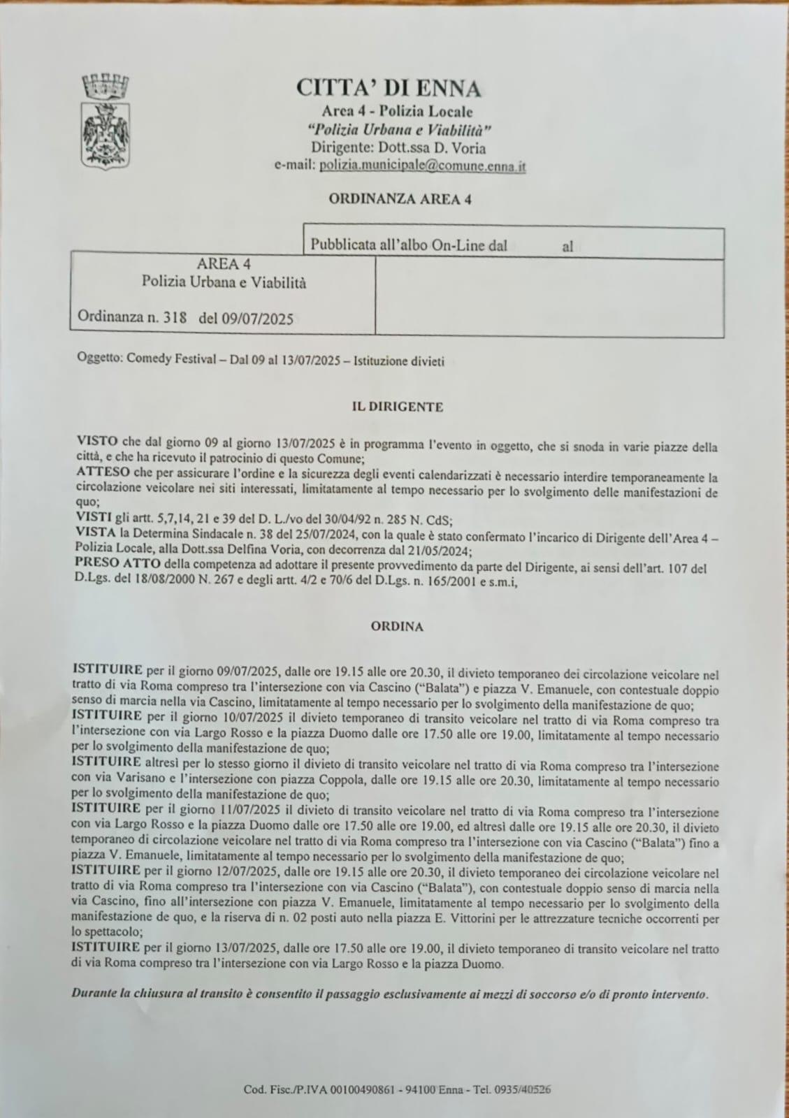 Il Comando della Polizia Locale di Enna in occasione degli eventi del Comedy Festival ha disposto quanto segue: ISTITUIRE per il giorno 09/07/2025, dalle ore 19.15 alle ore 20.30, il divieto temporaneo di circolazione veicolare nel tratto di via Roma compreso tra l’intersezione con via Cascino (“Balata”) e piazza V. Emanuele, con contestuale doppio senso di marcia nella via Cascino, limitatamente al tempo necessario per lo svolgimento della manifestazione; ISTITUIRE per il giorno 10/07/2025 il divieto temporaneo di transito veicolare nel tratto di via Roma compreso tra l’intersezione con via Largo Rosso e la piazza Duomo dalle ore 17.50 alle ore 19.00, limitatamente al tempo necessario per lo svolgimento della manifestazione; ISTITUIRE altresì per lo stesso giorno il divieto di transito veicolare nel tratto di via Roma compreso tra l’intersezione con via Varisano e l’intersezione con piazza Coppola, dalle ore 19.15 alle ore 20.30, limitatamente al tempo necessario per lo svolgimento della manifestazione; ISTITUIRE per il giorno 11/07/2025 il divieto di transito veicolare nel tratto di via Roma compreso tra l’intersezione con via Largo Rosso e la piazza Duomo dalle ore 17.50 alle ore 19.00, ed altresì dalle ore 19.15 alle ore 20.30, il divieto temporaneo di circolazione veicolare nel tratto di via Roma compreso tra l’intersezione con via Cascino (“Balata”) fino a piazza V. Emanuele, limitatamente al tempo necessario per lo svolgimento della manifestazione; ISTITUIRE per il giorno 12/07/2025, dalle ore 19.15 alle ore 20.30, il divieto temporaneo dei circolazione veicolare nel tratto di via Roma compreso tra l’intersezione con via Cascino (“Balata”), con contestuale doppio senso di marcia nella via Cascino, fino all’intersezione con piazza V. Emanuele, limitatamente al tempo necessario per lo svolgimento della manifestazione de quo, e la riserva di n. 02 posti auto nella piazza E. Vittorini per le attrezzature tecniche occorrenti per lo spettacolo; ISTITUIRE per il giorno 13/07/2025, dalle ore 17.50 alle ore 19.00, il divieto temporaneo di transito veicolare nel tratto di via Roma compreso tra l’intersezione con via Largo Rosso e la piazza Duomo. Durante la chiusura al transito è consentito il passaggio esclusivamente ai mezzi di soccorso e/o di pronto intervento.